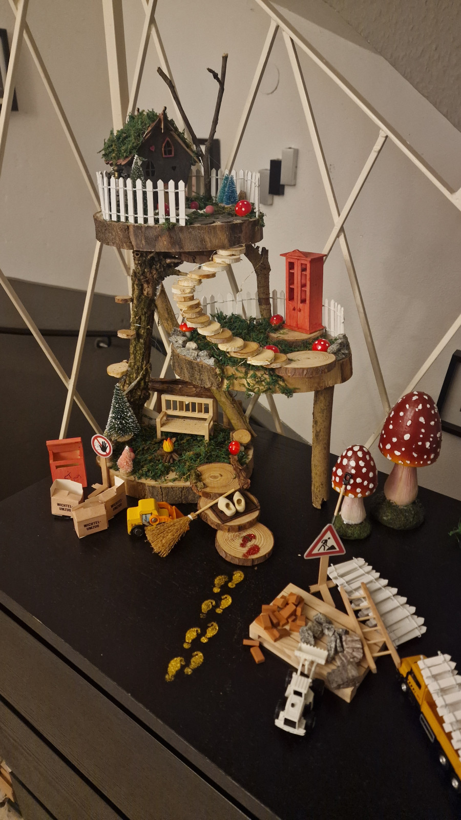 Die Spannung war groß, und jetzt ist es endlich so weit: Unser Wichtel Lilu ist eingezogen! Mit ihrem Häuschen hat sie einen Platz bei uns gefunden, und obwohl der Bau noch nicht ganz abgeschlossen ist, sieht man schon, wie liebevoll es gestaltet ist. In den nächsten Tagen wird noch hier und da gehämmert und geschraubt, aber das hält Lilu nicht davon ab, bereits heimisch zu werden.